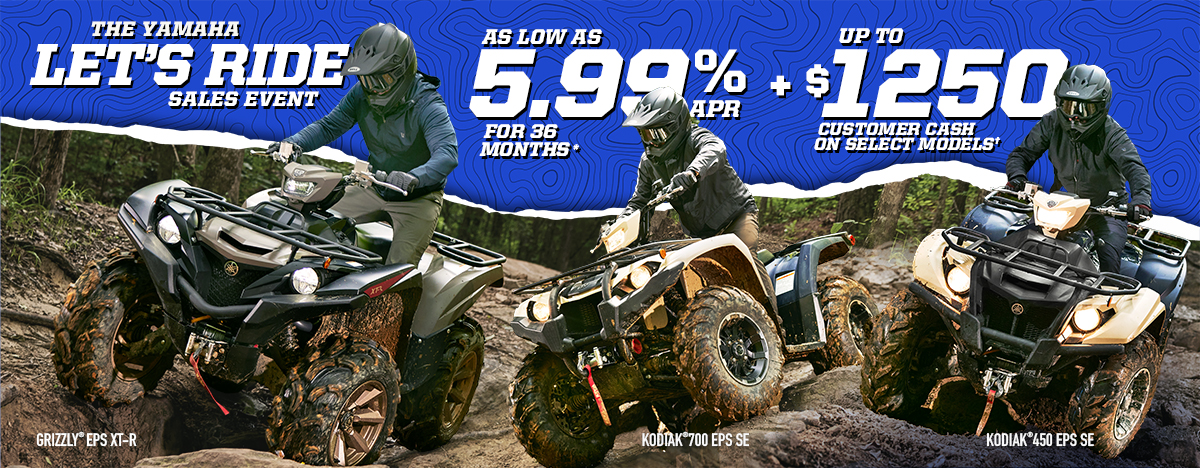 * Offer available on approved purchases of new 2023 – 2026 Yamaha ATV made on the Yamaha Credit Card issued by WebBank. Offer valid 7/1/2025 – 9/30/2025. Account must be open and current to be eligible for this offer. Promotional 5.99%, 7.99%, 14.49%, 21.99% APR financing with minimum payments of 3.05%, 3.14%, 3.45%, or 3.82% are effective until the purchase is paid in full. Minimum interest charge $2 per month. Promotional rates are based on creditworthiness. Not all applicants will qualify.