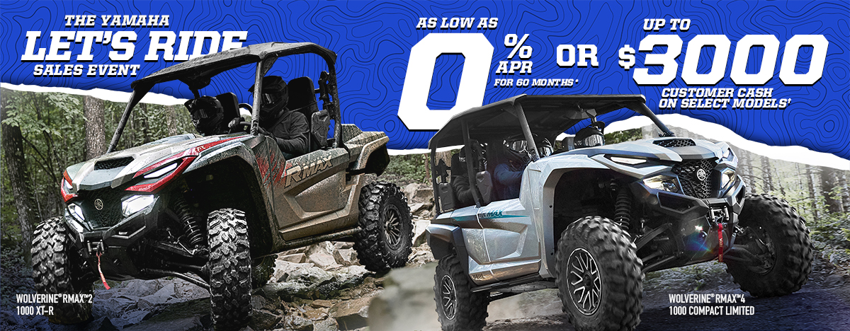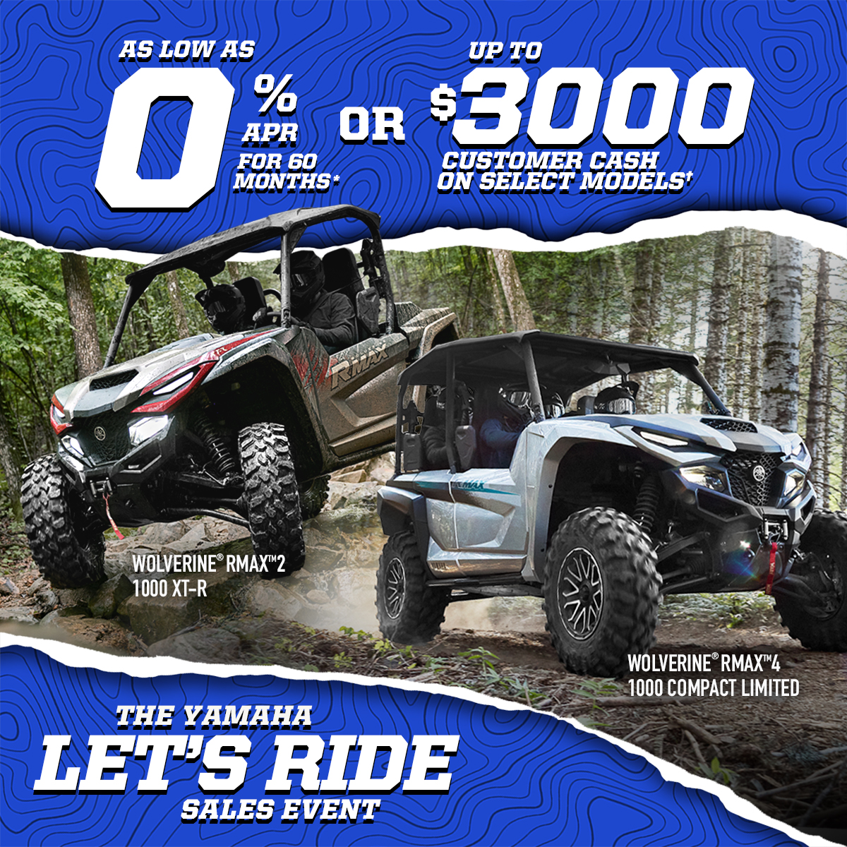 * Available for well qualified tier 1 and tier 2 credit customers who finance through Yamaha Motor Finance Corporation, U.S.A. Offer valid 7/1/2025 - 9/30/2025. 0% APR financing for 60 months at $16.67 per month per $1,000 financed regardless of down payment. Must take delivery from retail stock by 9/30/2025 on purchases of new 2023-2024 Yamaha RMAX, Wolverine X2, Wolverine X4 Side by Side. Available on approved credit through Yamaha Financial Services. Promotional rates are based on creditworthiness. Not all buyers will qualify. Higher financing rates apply for buyers with lower credit ratings. Offer cannot be combined with customer cash.